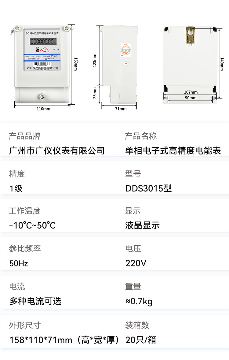 DDS3015型单相电子式电能表,系采用质量优良的大规模集成电路以及SMT技术。步进电机驱动机械机构的计度器和液晶显示计度器,停电不丢失记录的数据,是国内结构的电能表产品之一。本产品用来计量电压220V,参比频率50HZ的交流单相有功电能,性能符合GB/T17215.321-2008标准。